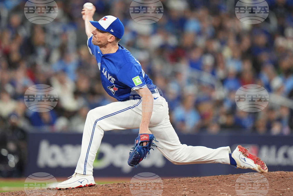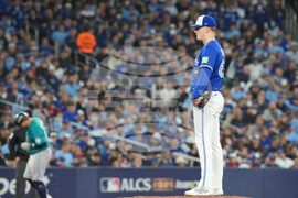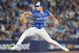 Toronto Blue Jays pitcher Chris Bassitt throws against the Seattle Mariners during the seventh inning of Game 2 of baseball's American League Division Series in Toronto, Monday, Oct. 13, 2025. (Frank Gunn/The Canadian Press via AP)