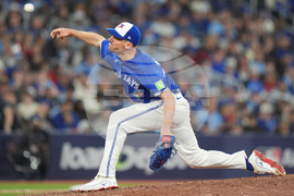 Toronto Blue Jays pitcher Mason Fluharty throw against the Seattle Mariners during Game 2 of baseball's American League Division Series in Toronto, Monday, Oct. 13, 2025. (Chris Young/The Canadian Press via AP)