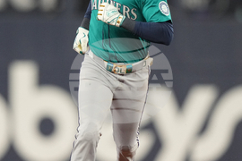 Seattle Mariners' Jorge Polanco rounds the bases after hitting a three-run home run during the fifth inning of Game 2 of baseball's American League Division Series against the Toronto Blue Jays in Toronto, Monday, Oct. 13, 2025. (Nathan Denette/The Canadian Press via AP)
