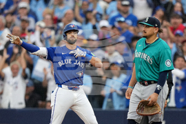 Seattle Mariners' Jorge Polanco, center, celebrates after his three-run home run with teammate Randy Arozarena (56) as Toronto Blue Jays catcher Alejandro Kirk, right, looks on during the fifth inning of Game 2 of baseball's American League Division Series in Toronto, Monday, Oct. 13, 2025. (Frank Gunn/The Canadian Press via AP)