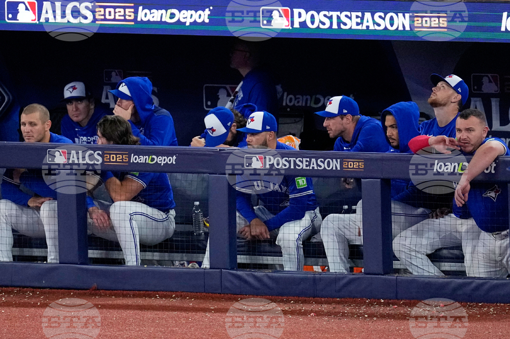 Toronto Blue Jays players watch from the dugout during the ninth inning in Game 2 of baseball's American League Championship Series against the Seattle Mariners, Monday, Oct. 13, 2025, in Toronto. (AP Photo/David J. Phillip)