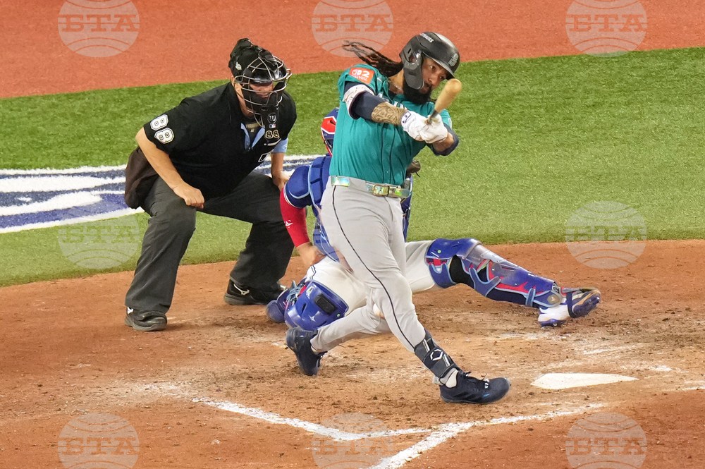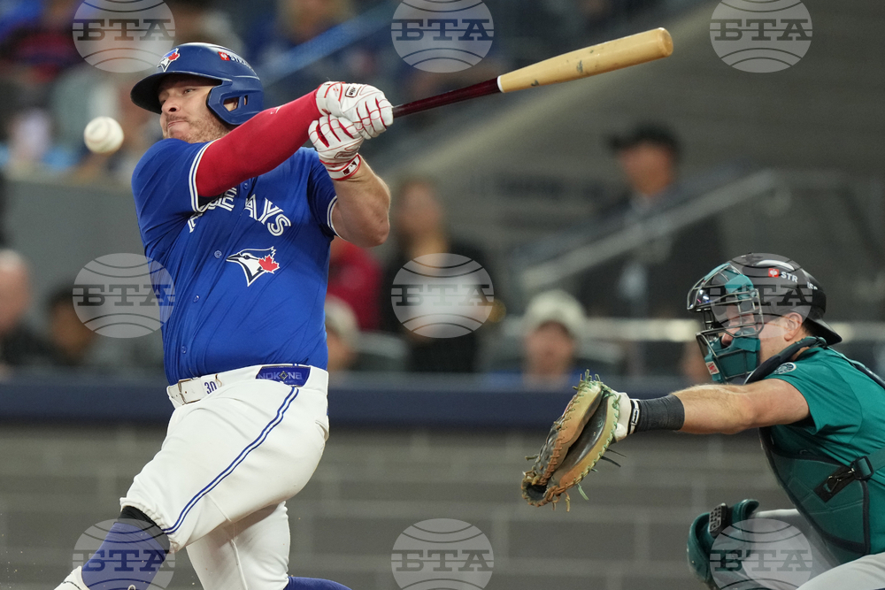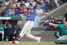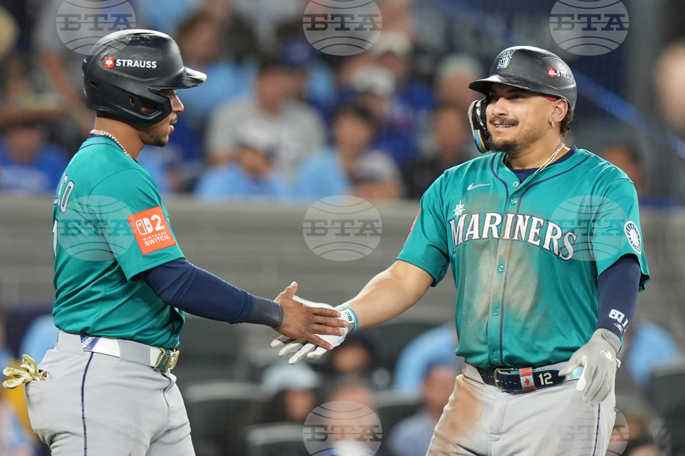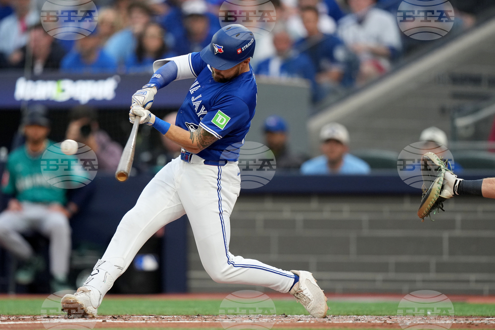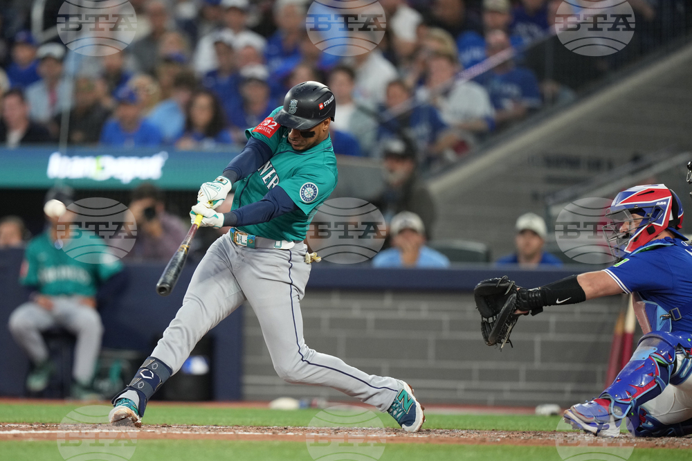 Seattle Mariners' J.P. Crawford, front, hits an RBI single during the sixth inning of Game 2 of baseball's American League Division Series against the Toronto Blue Jays in Toronto, Monday, Oct. 13, 2025. (Frank Gunn/The Canadian Press via AP)Chris Young/The Canadian Press via AP)