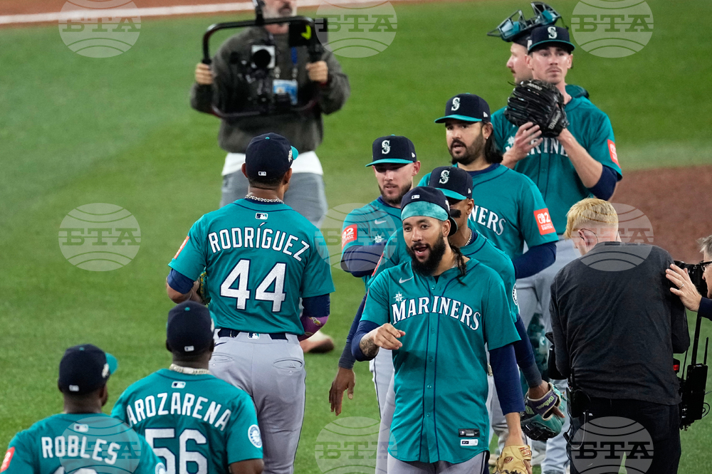 The Seattle Mariners celebrate after Game 2 of baseball's American League Championship Series against the Toronto Blue Jays, Monday, Oct. 13, 2025, in Toronto. (AP Photo/David J. Phillip)