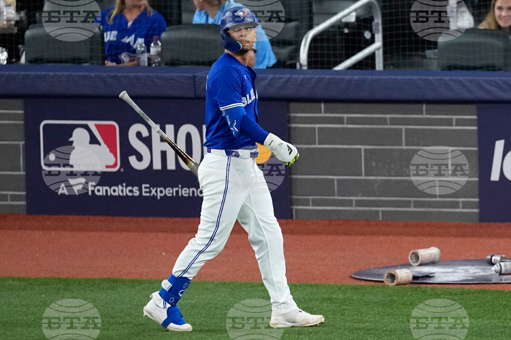 Toronto Blue Jays left fielder Davis Schneider takes a break as umpires confer about a call ruled a throwing error during the fifth inning of Game 2 of baseball's American League Division Series against the Seattle Mariners in Toronto, Monday, Oct. 13, 2025. (Chris Young/The Canadian Press via AP)