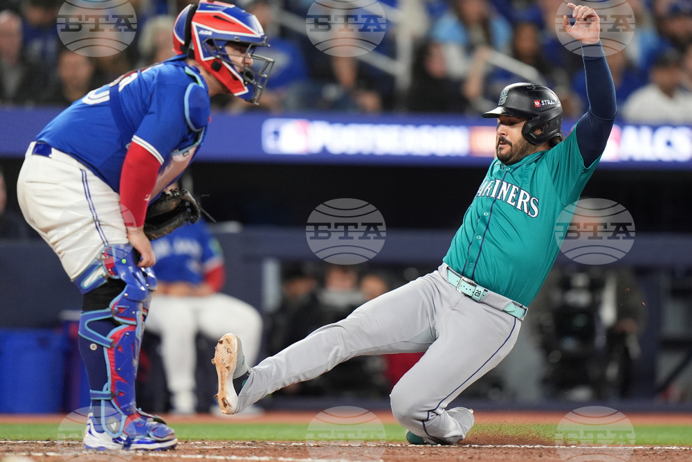Seattle Mariners' Eugenio Suárez, bottom right, is safe at home on a sacrifice fly hit by teammate J.P. Crawford as Toronto Blue Jays catcher Alejandro Kirk, bottom left, and pitcher Chris Bassitt, top, look on during the seventh inning of Game 2 of baseball's American League Division Series in Toronto, Monday, Oct. 13, 2025. (Chris Young/The Canadian Press via AP)