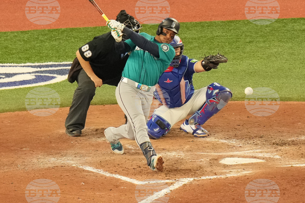 Seattle Mariners' J.P. Crawford, front, hits an RBI single during the sixth inning of Game 2 of baseball's American League Division Series against the Toronto Blue Jays in Toronto, Monday, Oct. 13, 2025. (Chris Young/The Canadian Press via AP)