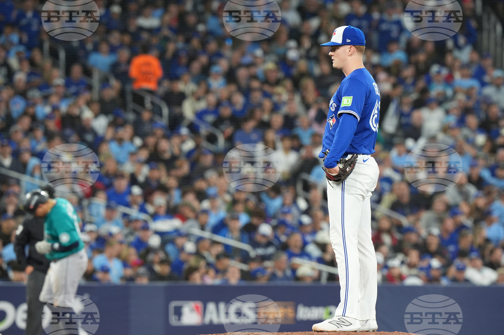 Seattle Mariners pitcher Eduard Bazardo throws to first base to get out Toronto Blue Jays' Vladimir Guerrero Jr. during the fifth inning of Game 2 of baseball's American League Division Series in Toronto, Monday, Oct. 13, 2025. (Frank Gunn/The Canadian Press via AP)