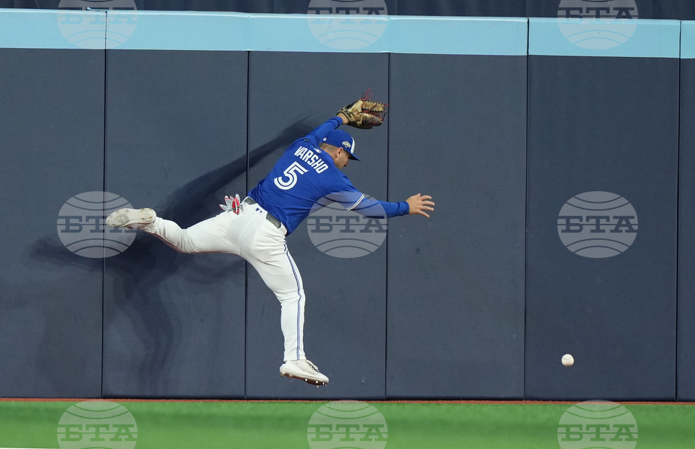 Toronto Blue Jays center fielder Daulton Varsho tries to track down a hit by Seattle Mariners' Mitch Garver during the sixth inning of Game 2 of baseball's American League Division Series in Toronto, Monday, Oct. 13, 2025. (Frank Gunn/The Canadian Press via AP)