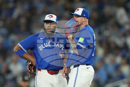 Toronto Blue Jays manager John Schneider, left, pulls pitcher Trey Yesavage (39) during the fifth inning of Game 2 of baseball's American League Division Series against the Seattle Mariners in Toronto, Monday, Oct. 13, 2025. (Frank Gunn/The Canadian Press via AP)