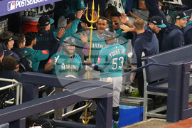 Seattle Mariners' Josh Naylor, center left, celebrates in the dugout after hitting a two-run home run against the Toronto Blue Jays during the seventh inning of Game 2 of baseball's American League Division Series against the Toronto Blue Jays in Toronto, Monday, Oct. 13, 2025. (Frank Gunn/The Canadian Press via AP)Chris Young/The Canadian Press via AP)