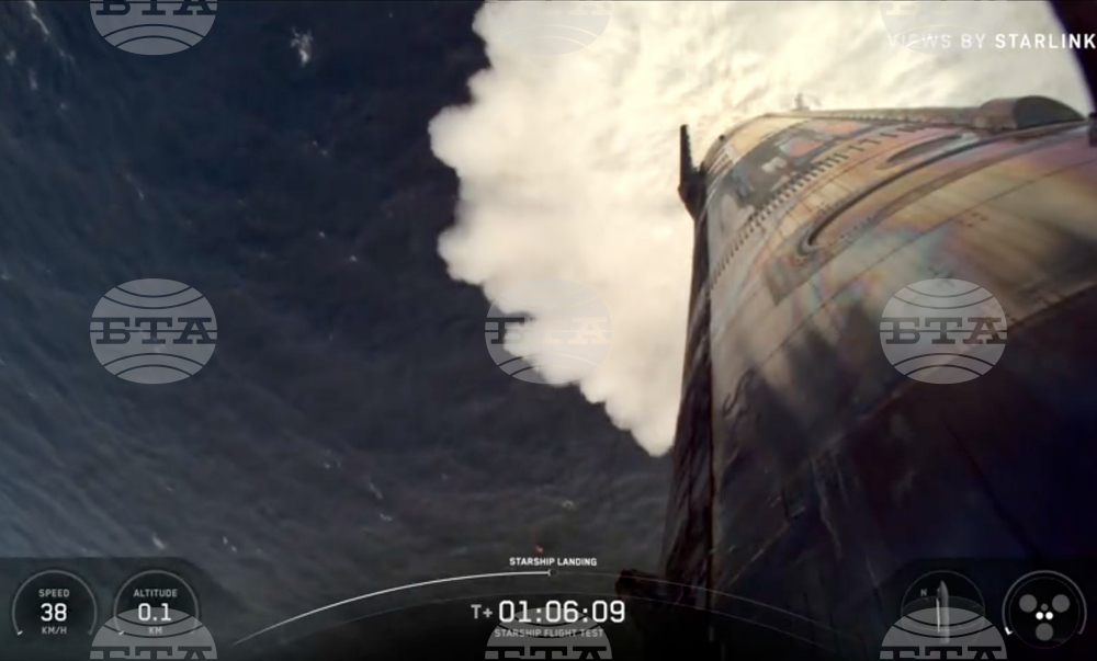 This image made from video provided by SpaceX shows a Starship flight test landing in the Indian Ocean after launching from Starbase, Texas, Monday, Oct. 13, 2025. (SpaceX via AP)