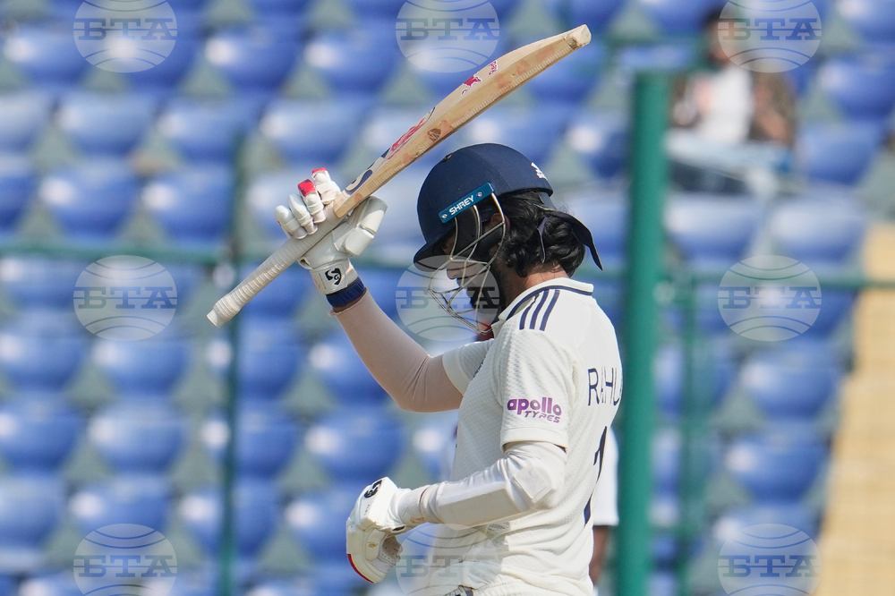 India's KL Rahul celebrates after scoring fifty runs on the fifth day of the second cricket test match between India and West Indies at the Arun Jaitley Stadium in New Delhi, India, Tuesday, Oct.14, 2025. (AP Photo/Manish Swarup)