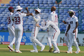 West Indies' captain Roston Chase celebrates with teammates after the dismissal of India's Sai Sudharsan on the fifth day of the second cricket test match between India and West Indies at the Arun Jaitley Stadium in New Delhi, India, Tuesday, Oct.14, 2025. (AP Photo/Manish Swarup)