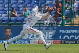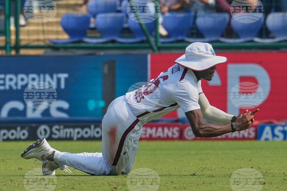 West Indies' Justin Greaves takes the catch of India's captain Shubman Gill on the fifth day of the second cricket test match between India and West Indies at the Arun Jaitley Stadium in New Delhi, India, Tuesday, Oct.14, 2025. (AP Photo/Manish Swarup)