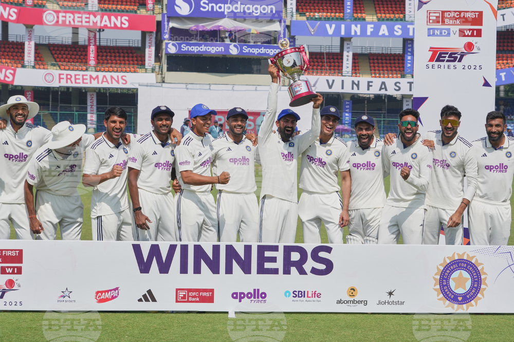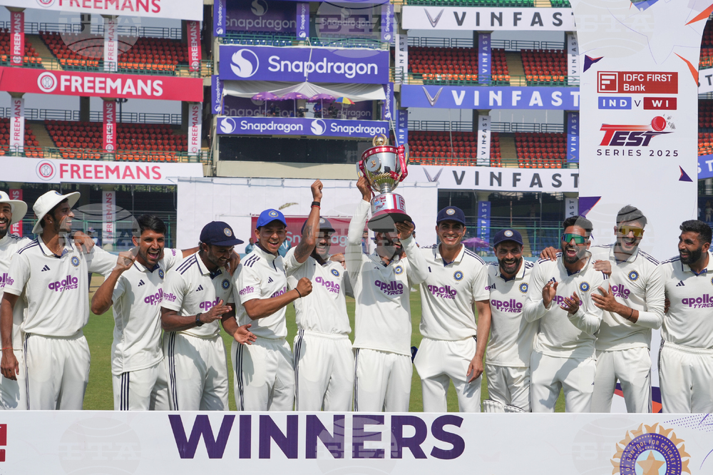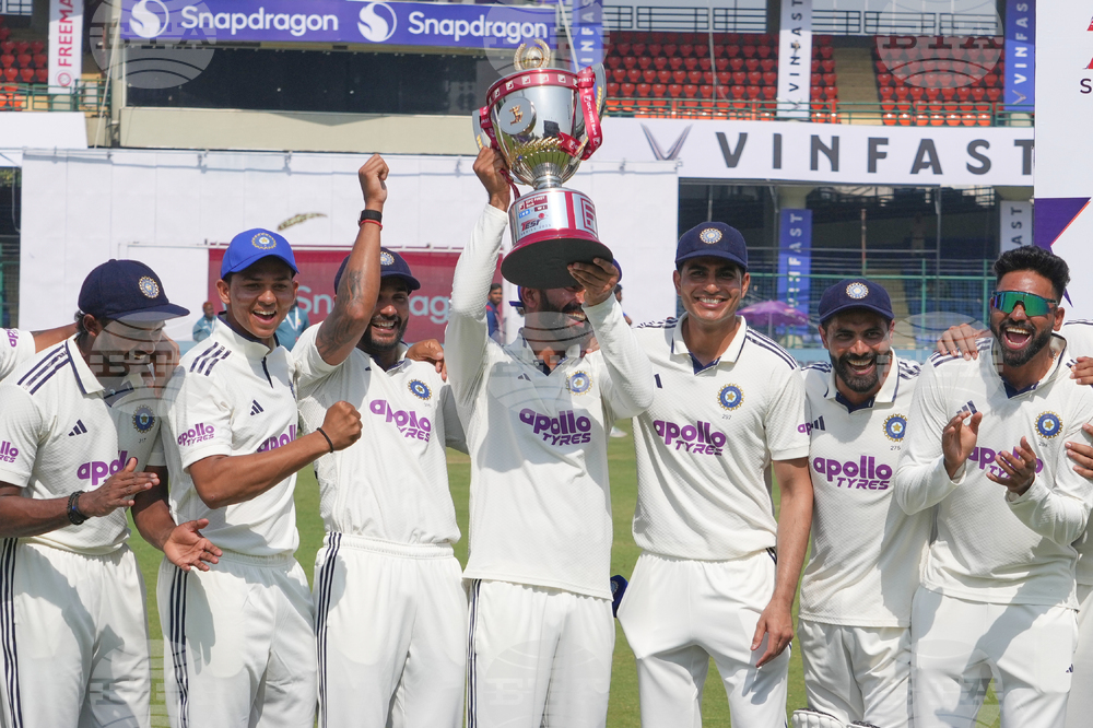 Indian players celebrate with the trophy after wining the India and West Indies test match series at the Arun Jaitley Stadium in New Delhi, India, Tuesday, Oct.14, 2025. (AP Photo/Manish Swarup)