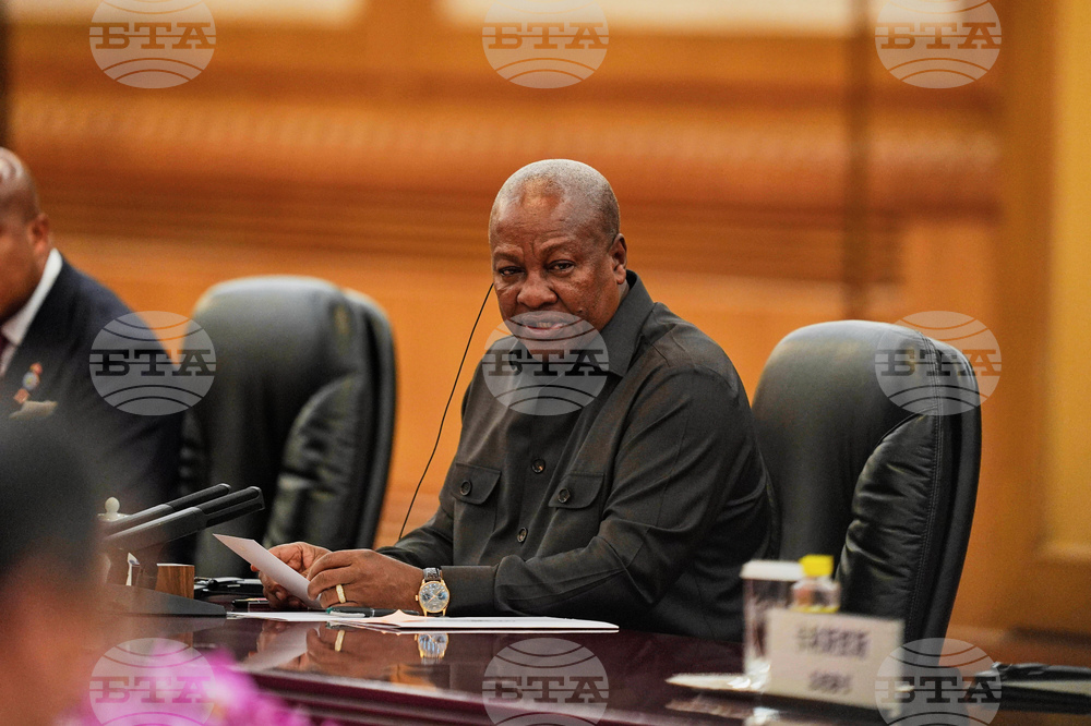 Ghana's President John Mahama speaks during a meeting with Chinese President Xi Jinping, unseen, at the Great Hall of the People in Beijing, China, Tuesday, Oct. 14, 2025. (Ichiro Banno/Pool Photo via AP)