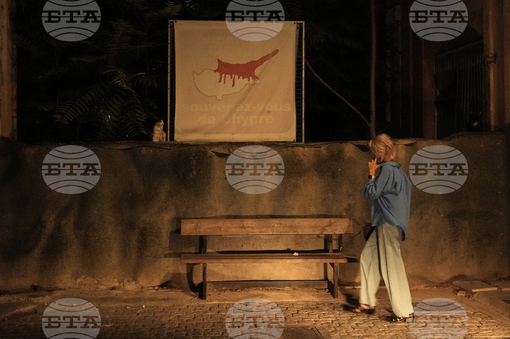 A woman walks at the old city as a cat sits on the sandbags wall in divided capital Nicosia, Cyprus, Sept. 26, 2025. (AP Photo/Petros Karadjias)