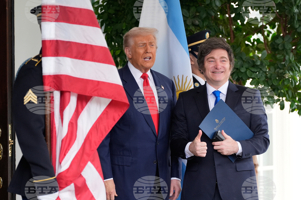 President Donald Trump greets Argentina's President Javier Milei at the White House, Tuesday, Oct. 14, 2025, in Washington. (AP Photo/Alex Brandon)