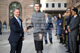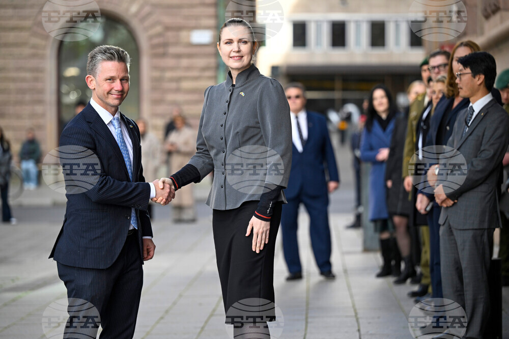 Sweden's Minister of Defense Pål Jonson, centre, and Lithuanian Minister of Defense Dovile Sakaliene shake hands during their meeting in Rosenbadsparken, outside the government head quarters Rosenbad, in Stockholm, Tuesday, Oct. 14, 2025. (Fredrik Sandberg/TT News Agency via AP)