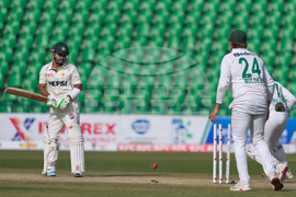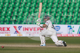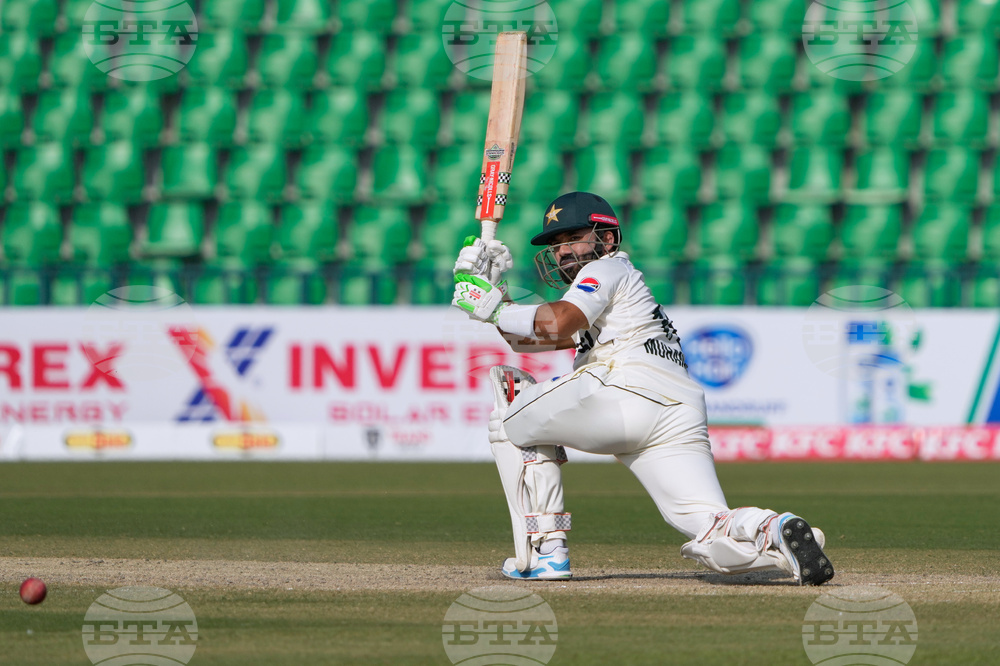 Pakistan's Mohammad Rizwan plays a shot during the third day of the first test cricket match between Pakistan and South Africa, in Lahore, Pakistan, Tuesday, Oct. 14, 2025. (AP Photo/K.M. Chaudary)