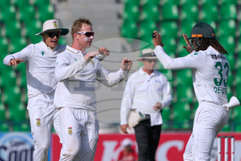 South Africa's Simon Harmer, right celebrates with teammates after taking the wicket of Pakistan's Mohammad Rizwan during the third day of the first test cricket match between Pakistan and South Africa, in Lahore, Pakistan, Tuesday, Oct. 14, 2025. (AP Photo/K.M. Chaudary)