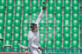 South Africa's Senuran Muthusamy bowls during the third day of the first test cricket match between Pakistan and South Africa, in Lahore, Pakistan, Tuesday, Oct. 14, 2025. (AP Photo/K.M. Chaudary)