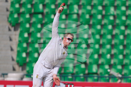 South Africa's Simon Harmer bowls during the third day of the first test cricket match between Pakistan and South Africa, in Lahore, Pakistan, Tuesday, Oct. 14, 2025. (AP Photo/K.M. Chaudary)