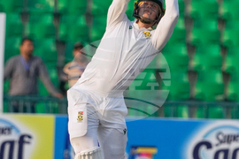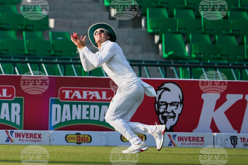 South Africa's Dewald Brevis takes the catch of Pakistan's Hasan Ali during the third day of the first test cricket match between Pakistan and South Africa, in Lahore, Pakistan, Tuesday, Oct. 14, 2025. (AP Photo/K.M. Chaudary)