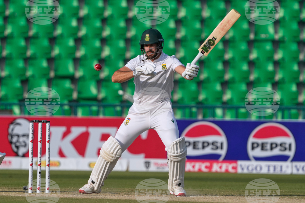 South Africa's Ryan Rickelton bats during the third day of the first test cricket match between Pakistan and South Africa, in Lahore, Pakistan, Tuesday, Oct. 14, 2025. (AP Photo/K.M. Chaudary)