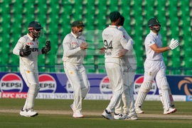 Pakistan's Noman Ali, right, and teammates celebrate after the dismissal of South Africa's Wiaan Mulder, second right, during the third day of the first test cricket match between Pakistan and South Africa, in Lahore, Pakistan, Tuesday, Oct. 14, 2025. (AP Photo/K.M. Chaudary)