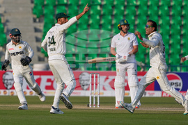Pakistan's Salman Ali Agha, left, and teammates celebrates after the dismissal of South Africa's Wiaan Mulder during the third day of the first test cricket match between Pakistan and South Africa, in Lahore, Pakistan, Tuesday, Oct. 14, 2025. (AP Photo/K.M. Chaudary)