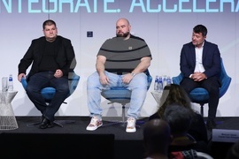 София (14 октомври 2025) В Sofia Event Center се провежда технологичен форум Technovation 2025, в който списание "Мениджър" е домакин. Програмата събира в един ден водещи гласове от индустрията, академията и предприемаческата екосистема, които ще обсъдят трансформативната роля на изкуствения интелект, облачните решения и киберсигурността в съвременния бизнес. На снимката: модераторът и главен редактор на "Мениджър News" Иван Нончев, технологичният предприемач, член на КС, БРАИТ, CEO на Vaerolabs и CleverPine Ventures Радослав Гайдарски (третият от ляво), и главният директор "Растеж", Сирма Груп Холдинг - Момчил Зарев (вдясно).