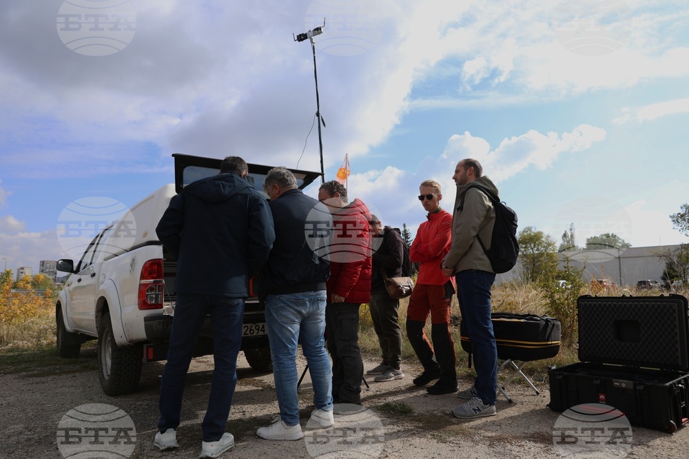 София (14 октомври 2025) Столична община и Софийският университет „Св. Климент Охридски“ използват безпилотни летателни апарати за заснемане на различни райони в София с цел изграждане на дигитален двойник на града. От картите ще бъде предоставена информация за състоянието на контейнерите за отпадъци, на пътната мрежа, зелените площи и незаконните сметища. На снимката: кметът на София Васил Терзиев (третият от ляво надясно) и доц. д-р Стелиян Димитров (вторият от дясно наляво) от Геолого-географския факултет на Софийския университет „Св. Климент Охридски“.