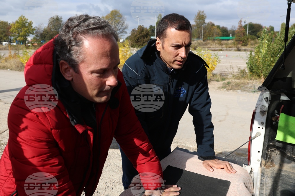 София (14 октомври 2025) Столична община и Софийският университет „Св. Климент Охридски“ използват безпилотни летателни апарати за заснемане на различни райони в София с цел изграждане на дигитален двойник на града. От картите ще бъде предоставена информация за състоянието на контейнерите за отпадъци, на пътната мрежа, зелените площи и незаконните сметища. На снимката: кметът на София Васил Терзиев (вляво) и доц. д-р Стелиян Димитров от Геолого-географския факултет на Софийския университет „Св. Климент Охридски“.