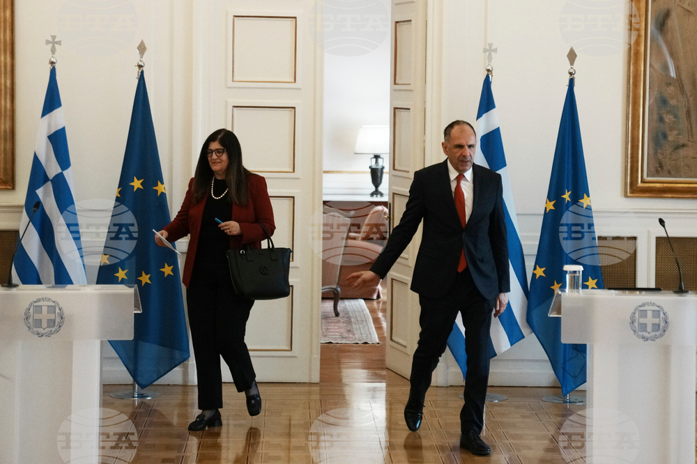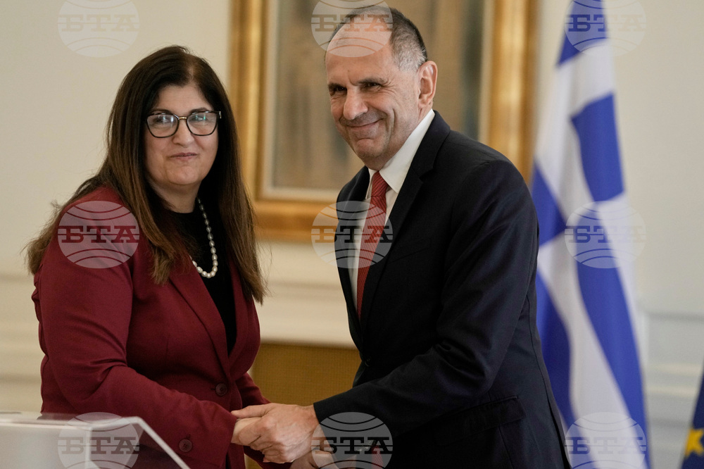 Palestinian Foreign Minister Varsen Aghabekian Shahin, left, and her Greek counterpart George Gerapetritis arrive for a news conference in Athens, Greece, Tuesday, Oct. 14, 2025. (AP Photo/Thanassis Stavrakis)