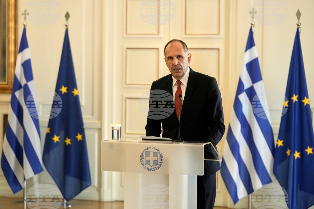 Greek Foreign Minister George Gerapetritis holds a news conference with his Palestinian counterpart Varsen Aghabekian Shahin in Athens, Greece, Tuesday, Oct. 14, 2025. (AP Photo/Thanassis Stavrakis)