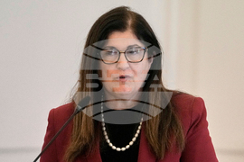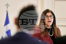 Palestinian Foreign Minister Varsen Aghabekian Shahin holds a news conference with her Greek counterpart George Gerapetritis in Athens, Greece, Tuesday, Oct. 14, 2025. (AP Photo/Thanassis Stavrakis)