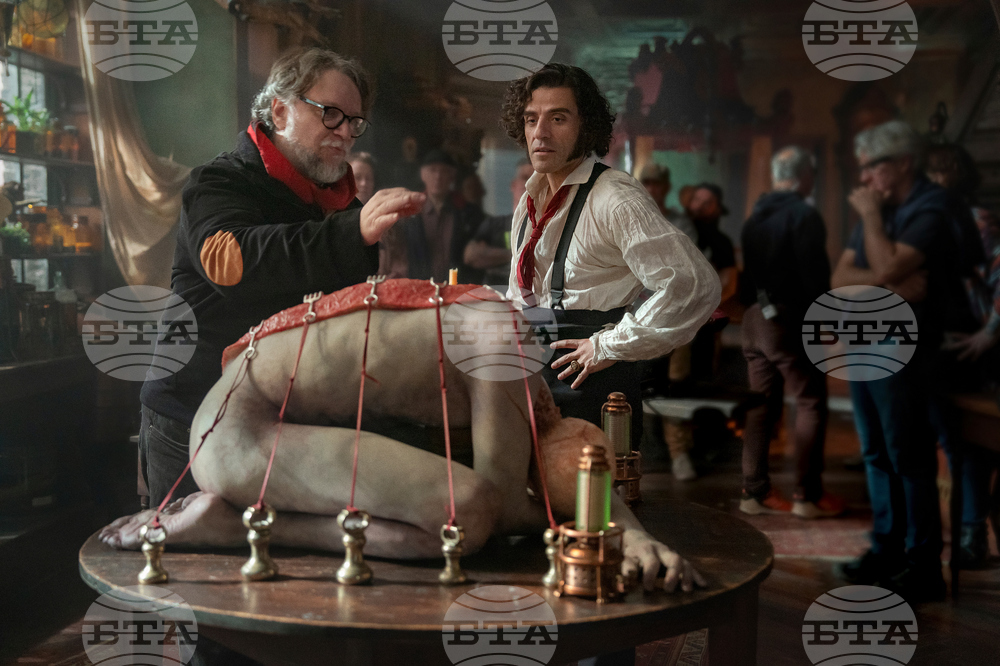 This image released by Netflix shows director Guillermo del Toro, left, and Oscar Isaac on the set of "Frankenstein." (Ken Woroner/Netflix via AP)