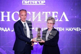 София (14 октомври 2025) Министерството на образованието и науката (МОН) връчва годишните Национални награди за принос в науката „Питагор”. На снимката: председателят на Комисията по образованието и науката в Народното събрание проф. Андрей Чорбанов награждава проф. Красимира Йончева от Фармацевтичния факултет на Медицински университет - София, за утвърден учен в областта на медицината и науките за живота.