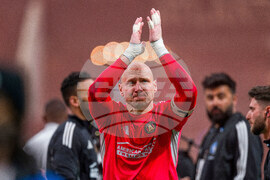 FILE - Atlanta United goalkeeper Brad Guzan applauds the crowd after an MLS soccer match against CF Montréal, Feb. 22, 2025, in Atlanta. (AP Photo/Danny Karnik, file)