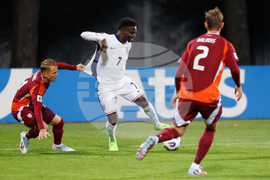 Latvia's Roberts Veips, left, challenges for the ball with England's Myles Lewis-Skelly during the 2026 World Cup group K qualifying soccer match between Latvia and England in Riga, Latvia, Tuesday, Oct. 14, 2025. (AP Photo/Roman Koksarov)
