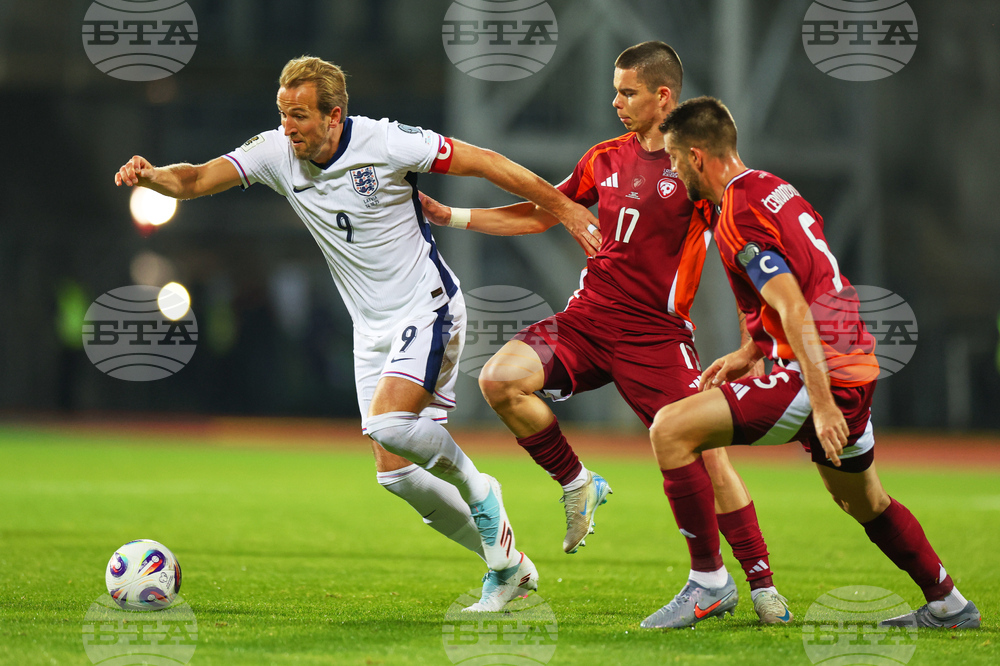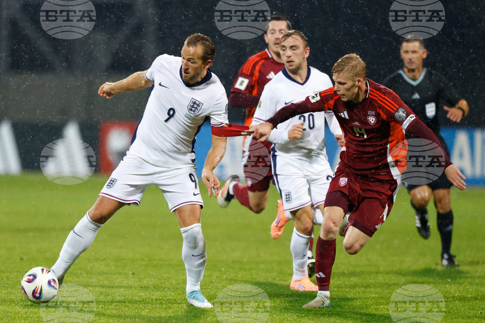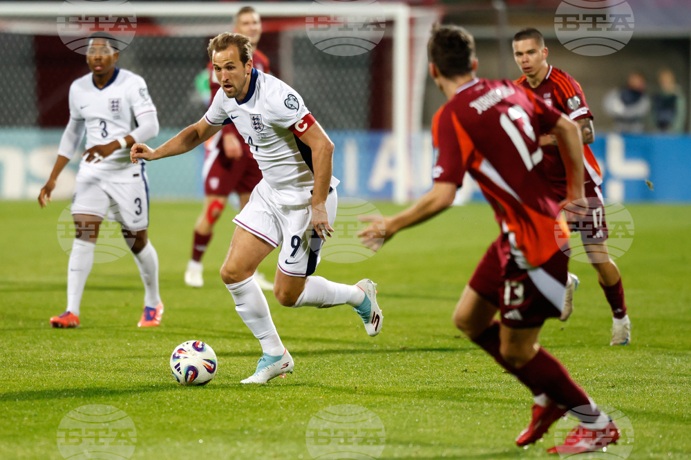 Latvia's Andrejs Ciganiks clears the ball from England's Harry Kane during the 2026 World Cup group K qualifying soccer match between Latvia and England in Riga, Latvia, Tuesday, Oct. 14, 2025. (AP Photo/Mindaugas Kulbis)