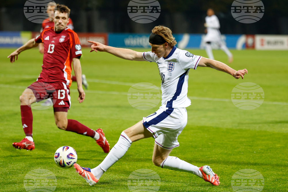 Latvia's Vladislavs Gutkovskis, left, challenges England's Elliot Anderson during the 2026 World Cup group K qualifying soccer match between Latvia and England in Riga, Latvia, Tuesday, Oct. 14, 2025. (AP Photo/Mindaugas Kulbis)