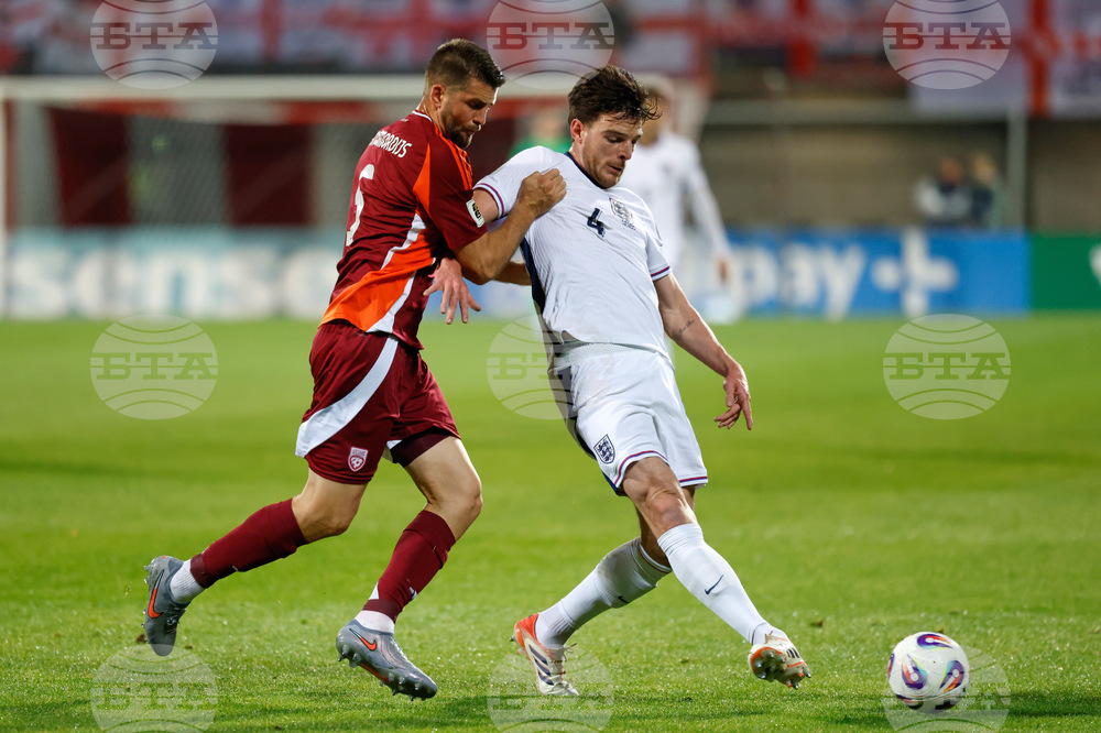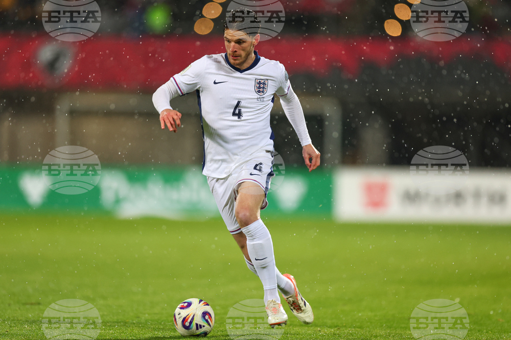 England's Declan Rice, second left, walks on the pitch with teammates before the 2026 World Cup group K qualifying soccer match between and Latvia and England in Riga, Latvia, Tuesday, Oct. 14, 2025. (AP Photo/Mindaugas Kulbis)