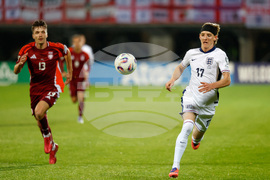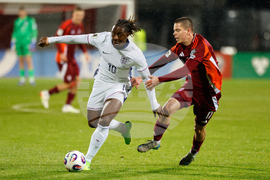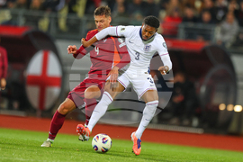England's Anthony Gordon takes on Latvia's Renārs Varslavans during the 2026 World Cup group K qualifying soccer match between Latvia and England in Riga, Latvia, Tuesday, Oct. 14, 2025. (AP Photo/Mindaugas Kulbis)