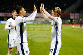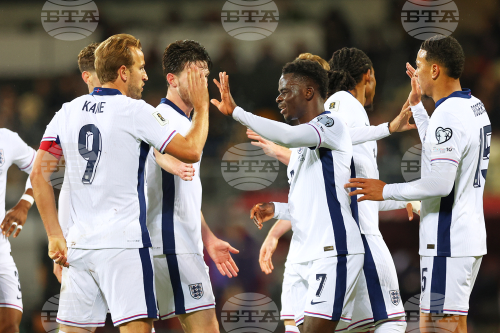 England players celebrate after Latvia scored an own goal during the 2026 World Cup group K qualifying soccer match between Latvia and England in Riga, Latvia, Tuesday, Oct. 14, 2025. (AP Photo/Mindaugas Kulbis)