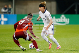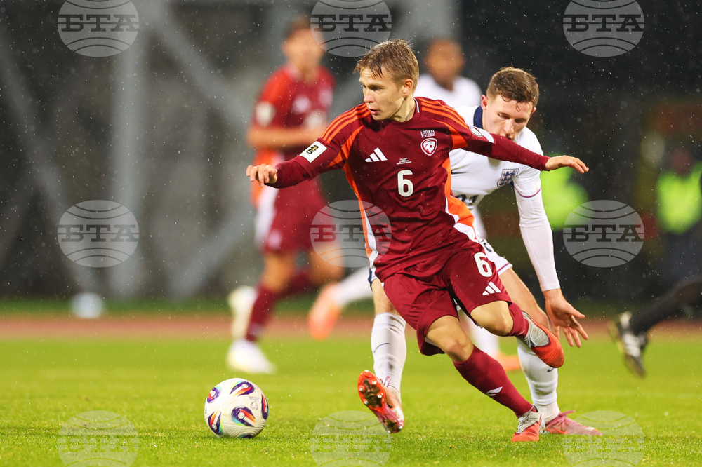 Latvia's Vladislavs Gutkovskis, left, challenges for the ball with England's John Stones during the 2026 World Cup group K qualifying soccer match between Latvia and England in Riga, Latvia, Tuesday, Oct. 14, 2025. (AP Photo/Roman Koksarov)