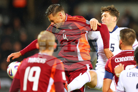 Latvia's Vladislavs Gutkovskis, right, challenges for the ball with England's Ezri Konsa during the 2026 World Cup group K qualifying soccer match between Latvia and England in Riga, Latvia, Tuesday, Oct. 14, 2025. (AP Photo/Roman Koksarov)