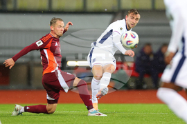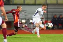 Latvia's Vladislavs Gutkovskis challenges for the ball with England's John Stones during the 2026 World Cup group K qualifying soccer match between Latvia and England in Riga, Latvia, Tuesday, Oct. 14, 2025. (AP Photo/Roman Koksarov)