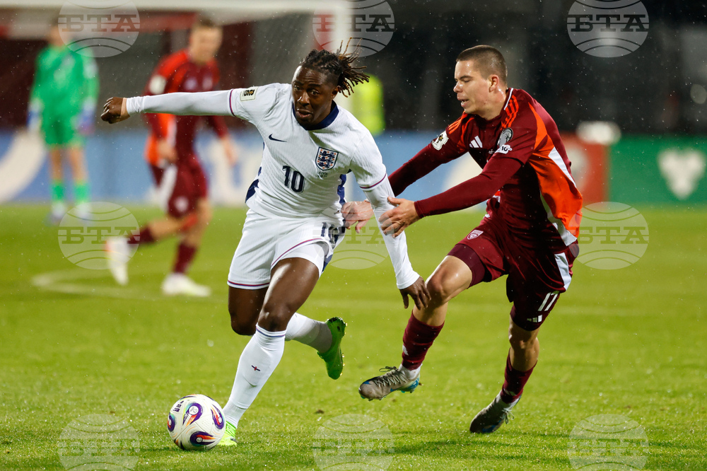 England's Bukayo Saka, left, is challenged by Latvia's Andrejs Ciganiks during the 2026 World Cup group K qualifying soccer match between Latvia and England in Riga, Latvia, Tuesday, Oct. 14, 2025. (AP Photo/Mindaugas Kulbis)